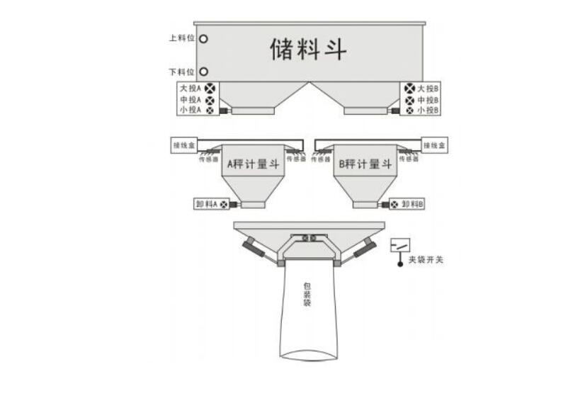 計量斗下面是夾袋裝置,夾袋裝置和卸料流口是一體的。套上包裝袋之后觸碰夾袋開關加緊袋子。電腦得到夾袋開關的信號之后開始對稱重完成的計量斗進行卸料,計量斗重量沒有達到設定重量不會卸料, A,B計量斗同時都完成稱重,會按程序設定優(yōu)先級先后卸料。